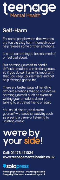 This blog was written as part acknowledging the success of distributing over 60000 our bookmarks for school aged children we distribute to schools and children's services in and near Suffolk for FREE. Below is our bookmark for self-harm.